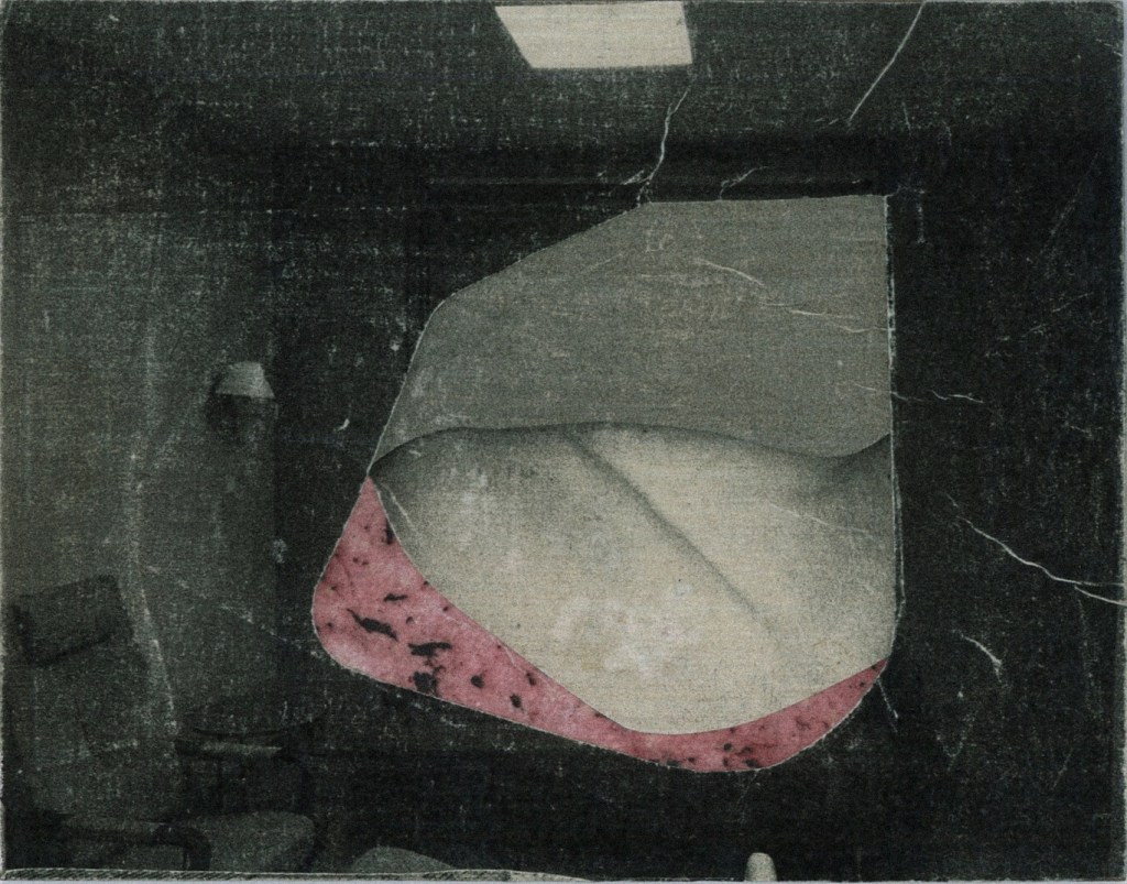 Furkan Öztekin’s collage series titled Tab solidifies an online search for AIDS visuals. He opens tabs with the sensational images of AIDS cases he found in the Turkish media archives, images from the KAOS GL Magazine (still publishing magazine by influential Ankara-based LGBTIQ organization with identitical name), some drawings, some photographs taken from inside and outside of the hospital where the exhibition also takes place. Copied, recorded, created images come together and contaminate each other; become as neutral as a virus, mixing positive and negative spaces of the conventional visual composition. Öztekin hides the faces and identities; accentuates the invisibleness. The archival images we can detect very partially from Öztekin’s collages appeared in an in-your-face manner on the shelves displaying Serdar Soydan’s study.